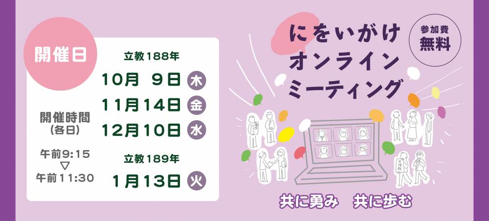 このたび本部布教部では、年祭活動の時旬に一層勇んでにをいがけに取り組んでいただく一助として、オンライン(ZOOM)で繋がった人たちと共ににをいがけに歩く「にをいがけオンラインミーティング」を開催します。