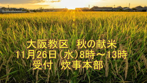 開始は11月3日(金)。時間は、お願いづとめ 終了後(午前11時45分ごろ)から午前12時30 分まで。なお、今年11月25日のお願いづとめは 午前12時開始、おさづけの取り次ぎは午後1時まで。
